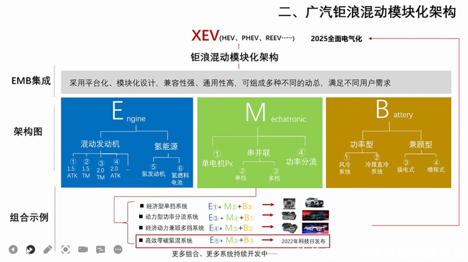 在此次发布会上,广汽也对钜浪混动EMB模块化架构进行了讲解,E指的是混动发动机,M指机电耦合系统,B指动力电池。