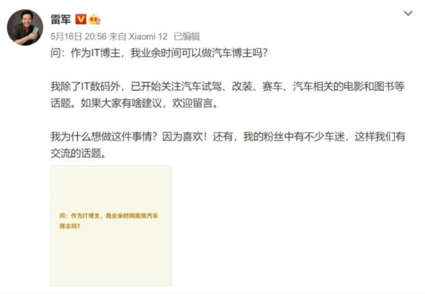 此前,雷军也曾在其个人微博发文称:“自己除了做IT博主之外,还准备业余时间做一个汽车博主。”谈及原因,雷军表示:“因为喜欢!还有我的粉丝中有不少车迷,这样我们有交流的话题。“根据爆料,雷军对小米汽车倾注了极大的精力,只要在小米科技园办公,几乎会有三分之二的时间待在小米汽车单独所处的办公楼里。