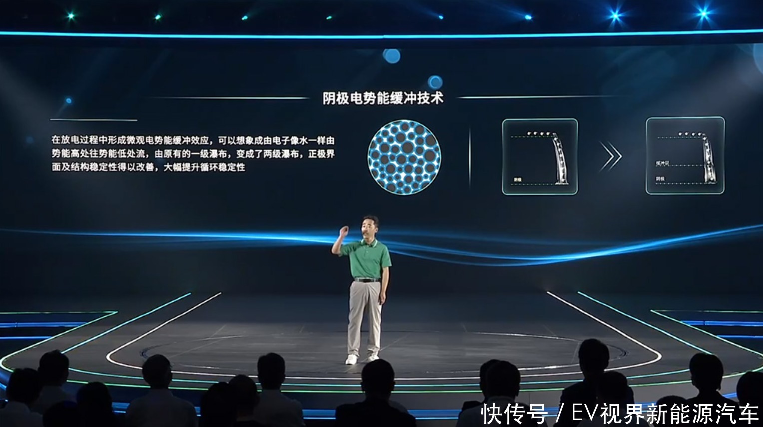 阴极电势能缓冲技术指的是,在放电过程中形成微观电势能缓冲效应,可以想象成电子像水一样由势能高处往势能低处流,由原有的一级瀑布,变成两级瀑布,正极界面及结构稳定性得以改善,从而提升循环充放电的稳定性。